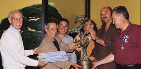 | Crespi Bonsai Cup - Intervista al vincitore Franco Saburri |  | Un sorridente Franco Saburri ritira la Coppa Crespi Bonsai: a consegnarla, oltre a Luigi Crespi e Tatemori Gondo anche i vincitori della scorsa edizione: Bruno Cerruti, Sergio Del Mese e Walter Pall. |