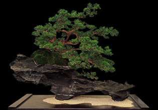 | maturata in me l'idea della composizione ishitsuki presentata alla Crespi Cup 2002. La pietra utilizzata è stata acquistata a Roma importata da Canton (Cina) e ha tutte le caratteristiche per essere considerata un materiale eccellente per un paesaggio su roccia. Il colore nero molto evocativo è stato evidenziato opacizzandolo con una semplice operazione: posta in un contenitore per due giorni a bagno in una soluzione di acido muriatico al 50% con acqua. Così facendo si è dissolta la patina di materiale calcareo, depositi e detriti che ne nascondevano la bellezza. Per comprenderci meglio è la stessa tipologia delle pietre che vengono poste sui bonsai commerciali o su paesaggi in vassoio di provenienza cinese, pietre cementate tra loro e di un colore nascosto; provate a trattarle in acido ed otterrete lo stesso risultato. Ma la pietra utilizzata per il mio ishitsuki è monolitica e totalmente naturale senza alcun ritocco, tra l'altro presenta molte caratteristiche intriganti nella forma, nelle parti concave, nella zona a sbalzo e nella galleria formata dalla base tanto da rendere perfettamente l'idea di un paesaggio molto aspro ed eroso dalla forza dell'acqua nel corso dei secoli. Per contrastare tali asperità ho scelto di utilizzare uno Juniperus |  L'affascinante Juniperus chinensis su roccia di Franco Saburri. |