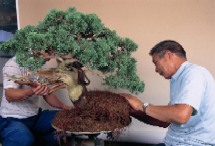 | | The International Meeting of Bonsai and Suiseki has become in the years, the most imitated manifestation in all Europe, but that is distinguished itself for the wealth of the contents, the quality and the organization of the program introduced. In the 2004 edition it proposes for the art of bonsai extraordinary guests, who will give proof of their technical ability through unknown techniques to the vanguard: Japanese master Toshio Ishii one of the first teaching of art bonsai, premonitory to the teaching increased to the world of the enthusiasts, and Master Cheng Cheng Kung great expert of Juniperus, conveiver and inventor of the method Si-Diao, thanks to which the carved dried wood on bonsai appears incredibly natural. TOSHIO ISHII Toshio Ishii is born the 19 October 1940 in the city of Maebashii - Gunma Prefecture - approximately 100 km to the north west of Tokyo. First of six brothers, soon after to have attended the school, he begins to help the father in the activity of planning and preparation of garden. The meeting with Tokijiro Kato, already well-established bonsai master who entertained relationships trades with the father, marks the beginning of its approach to this ar t. To those times living as bonsai professional was not simple, for who he was forced to relegate the studies finalizes to the own formation, and the job on the plants, to the evening hours, after days work in gardening. Precursor of the modern times, at the age of 24 years, in the surge of the popular interest for the Bonsai, begins to hold course for the enthusiasts, which caused the dissaproval of master Kato, little inclined to one amassed expansion of the Bonsai, and the consequent temporary break of their relations. His singular method to teach the art of Bonsai, however, earns much popularity among the participants of the “Ishii Bonsai Club”, so much to make grow local distributions in all Japan. Thanks to this particular approach to the Bonsai, very soon becomes one of the more popular and loved masters of Japan. To confirmation of the great creativity of Ishii, there are its numerous bonsai works, of unquestionably innovative character, 68 of which worked, during his long career, expressly for the prestigious Kokufu Exhibition. His unique strength lies in his ability to recognize in raw material, such as that from nursery or collected in nature, the potential of development in masterpieces bonsai and in the assiduous application of the techniques in the process of increase of the plants. Specialized in the shaping and the restyling, its fields of interest are a lot wide and included Juniperus, deciduous trees, flower and fruit species. He has participated to various convention that took place in the various Countries, among which United States, Spain, England, Korea and Taiwan. | | CHENG CHENG KUNG Born and grew in the countryside. Loving scenery and living in Taiwan, where with full of beautiful mountains and streams, makes him have many opportunities to climb up high mountains to directly observe trees in their natural environment. Such impressing experiences, no doubt, established the first basis for his future bonsai work. At an occasion in 1980, he read some treatises concerning about the bonsai art. At that time, he was fully inspired and reverenced to it - the ingenious art of combination of natural and artificial. Since that, he frequently decorated his house with lots of bonsai. Many relatives praised and encouraged him to engage in such field. Under their support and his own aspiration, “bonsai creator” has gradually been his lifetime career. One of the important issues for bonsai creation is how to catch the specific characteristic and spirit of each species. For example, Juniperus - the most famous species - is grown in the high altitude mountain, steep topography and barren land. Affected by the violent geography and climate, it always forms natural imperishable relics “sarira” (Sanskrit), shari (Japanese) on its trunk and branches. Sarira is a dead part but is an awarding sign of conquering difficulties. Moreover, its branches develop with philosophy of “share and allowance” instead of “competition”. Seem dead on one side (yin-negative) but still living on the other (yang-positive); tender but never yielding; share but never competing; Juniper, in fact, fully reveals the value of overcoming and accommodation in adverse circumstances. Thus, the deepest art is how to present such features in our Juniper bonsai. In order to break the limitations set by the employment of mechanical tools and to avoid the cutting artifact left behind, a special technique of “Si-Diao (silk-carving)” is adopted. The word of “Si-Diao” means a specific carving skill to obtain the “sarira” without any manmade trace just like silk, and to twist trunk and branches in an optimum way. The treated Bonsai exhibits not only simple beauty in form, but also the imperishable durability through years of weathering as well as the silk-like fine noble fiber and texture. Since he decided to throw himself into the unknown field of bonsai, he has faced many difficulties and obstructions as no instructor to guild him. At that time, he did not disappoint nor gave it up. Now, he would like to share and communicate his past experiences to you, and hope you can learn each other. The other difficulties will arise certainly, however, once if you see the nature, which is created by your hands, you will feel indescribable delight and feel all your diligent striving is worthy. He does an actively participation in international bonsai Convention to Philippine, Singapore, Mainland of China, South Africa. He was invited also to the 4th WBCM in Germany and the 6th Asia-Pacific Bonsai Convention in Malaysia. He teaches bonsai art in Bonsai Art Association of Taiwan.